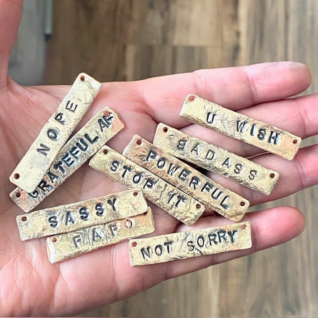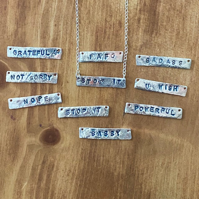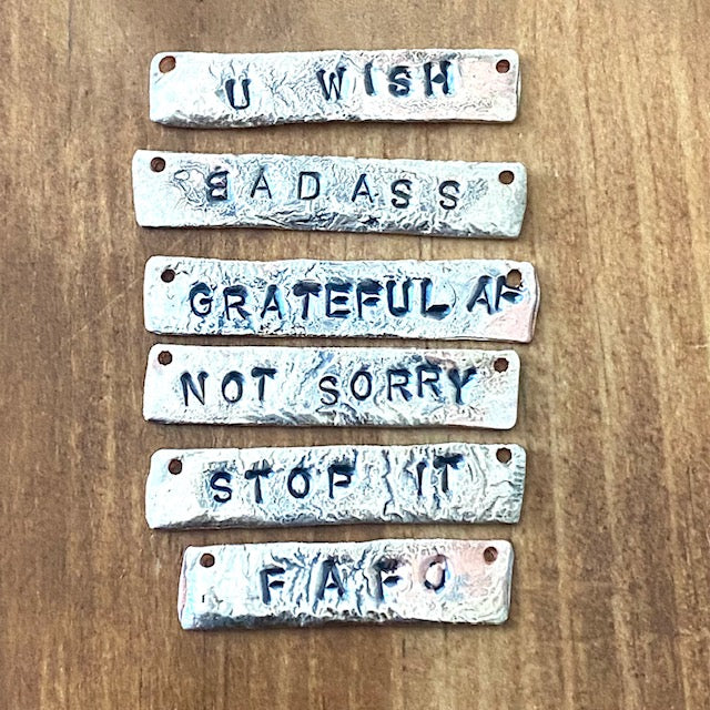 Choose from badass favorites like "U WISH," "BADASS," "GRATEFUL AF," "NOT SORRY," "STOP IT," or "FAFO"… or email me to create your own personal mantra.